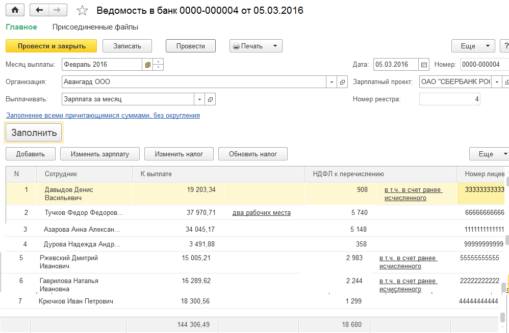 Для ООО "Авангард": Через банк по зарплатному проекту и Через банк перечислением на лицевые счета. Реквизиты уплаты по НДФЛ для всех документов: № 35 от 05.03.2016.