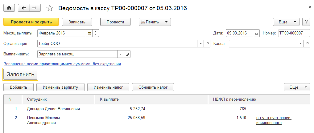 Для ООО "Трейд" через кассу. Реквизиты уплаты НДФЛ: № 30 от 05.03.2016.