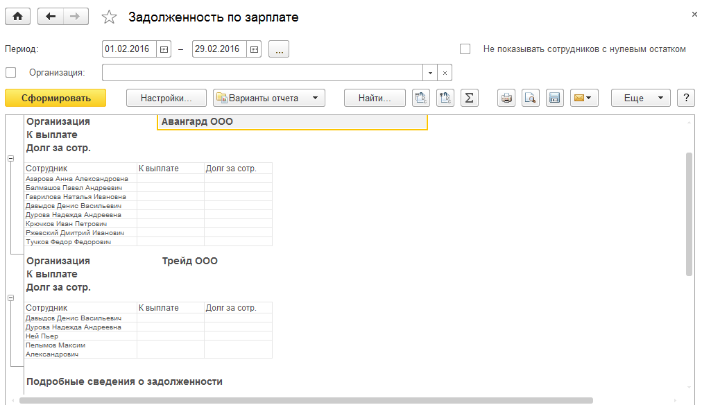 Проанализируем задолженность по зарплате с помощью одноименного отчета в разделе "Выплата/ Отчеты по выплатам".