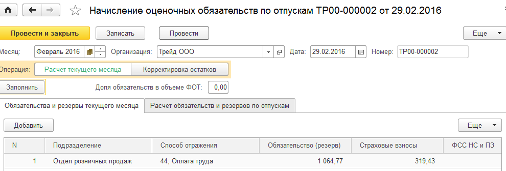4. Сформируем документ "Начисление оценочных обязательств по отпускам" за февраль для ООО "Трейд".