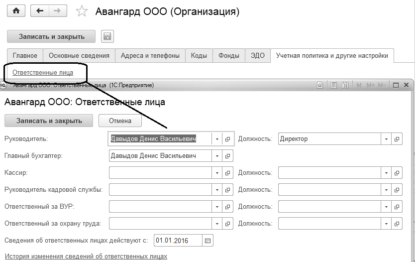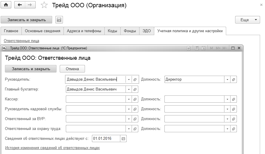 Аналогичным образом настроим ответственных лиц на 01.01.2016 для ООО "Трейд". Обратите внимание, что ответственное лицо выбирается не из справочника "Сотрудники", а из физических лиц.