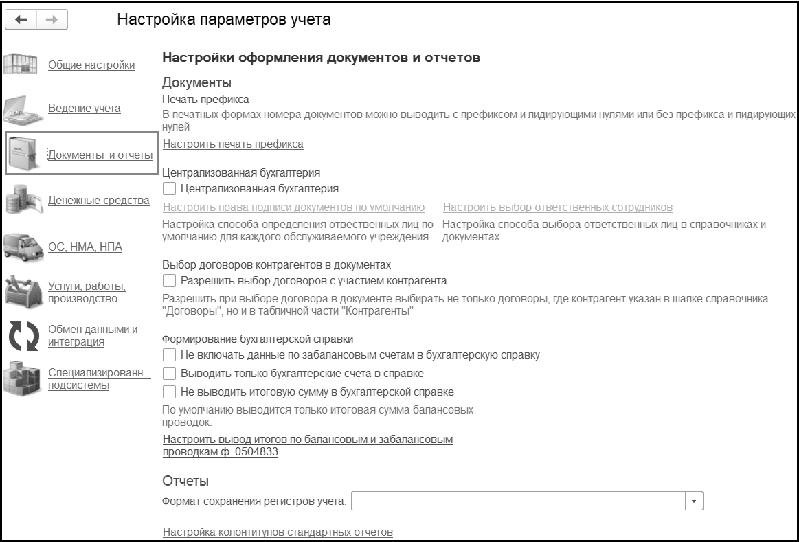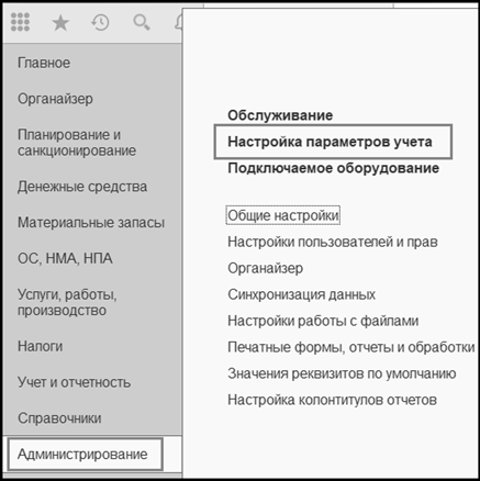 Прежде всего требуется настроить параметры учета. Форма для настройки параметров учета вызывается с помощью команды Настройка параметров учета раздела Администрирование.