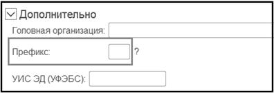 Префикс кодов / номеров объектов информационной базы – это префикс организации - строка, состоящая из двух символов, устанавливается в карточке учреждения - элемент справочника "Организации", закладка "Основные", группа реквизитов "Дополнительно ", реквизит "Префикс":