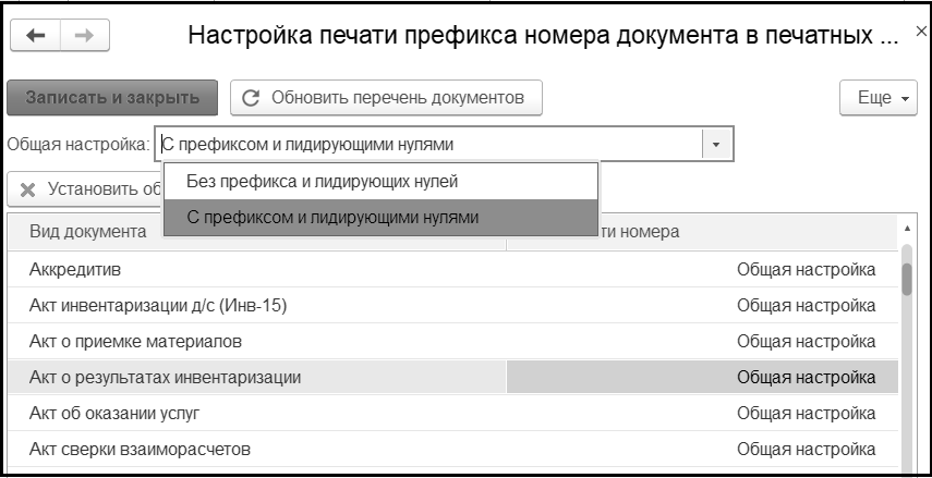 В программе предусмотрена настройка печати префикса и лидирующих нулей номера документа в печатных формах. Для любого документа можно установить вид печати номера: