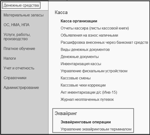 После включения функциональной опции "Оплата платежными картами (эквайринг)" в разделе "Денежные средства" в группе "Эквайринг" станут доступны команды для открытия списка документов "Эквайринговые операции" и "Управление эквайринговым терминалом".