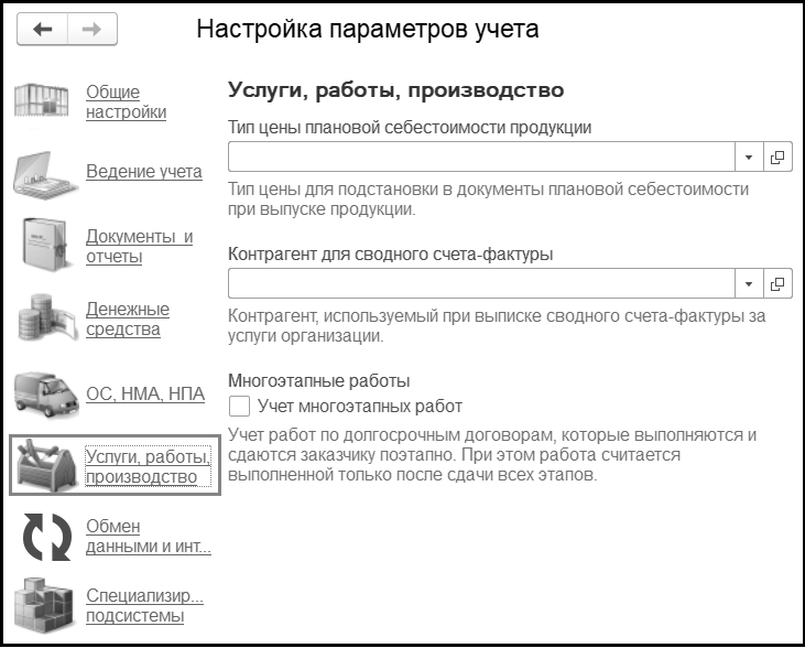 При выборе данной опции в разделе Услуги, работы, производство появятся новые объекты: справочник Этапы сдачи работ и документы Сдача этапа работ и Завершение работ, используемые для учета многоэтапных работ.