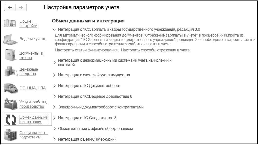 Группа Интеграция с 1С:Зарплата и кадры государственного учреждения, редакция 3.0. Обеспечивает настройку статей финансирования и способов отражения заработной платы в учете для автоматического формирования документов Отражение зарплаты в учете и Начисление резервов по отпускам в процессе их импорта из конфигурации 1С: Зарплата и кадры государственного учреждения, редакция 3.0.