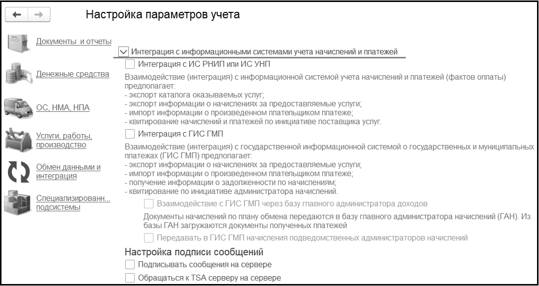 При отключении интеграции с государственной информационной системой о государственных и муниципальных платежах становится недоступен просмотр созданных в данной подсистеме документов.