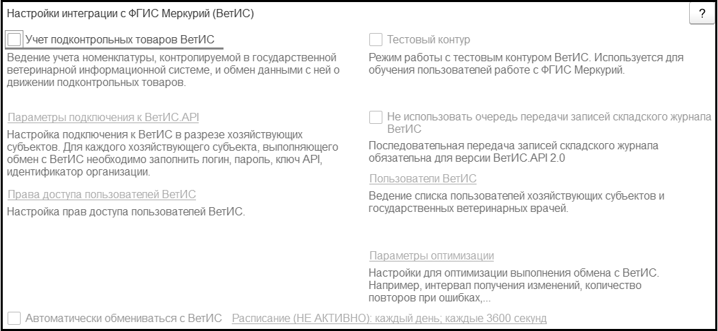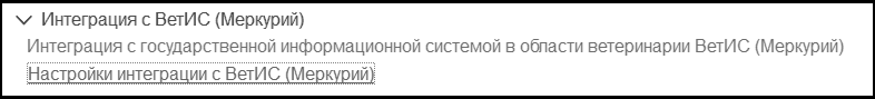 Чтобы начать использовать возможности взаимодействия с ФГИС "Меркурий", в программе БГУ необходимо включить функциональную опцию Учет подконтрольных товаров ВЕТИС и выполнить настройку взаимодействия с ВетИС – следует раскрыть группу команд Интеграция с ВетИС (Меркурий).