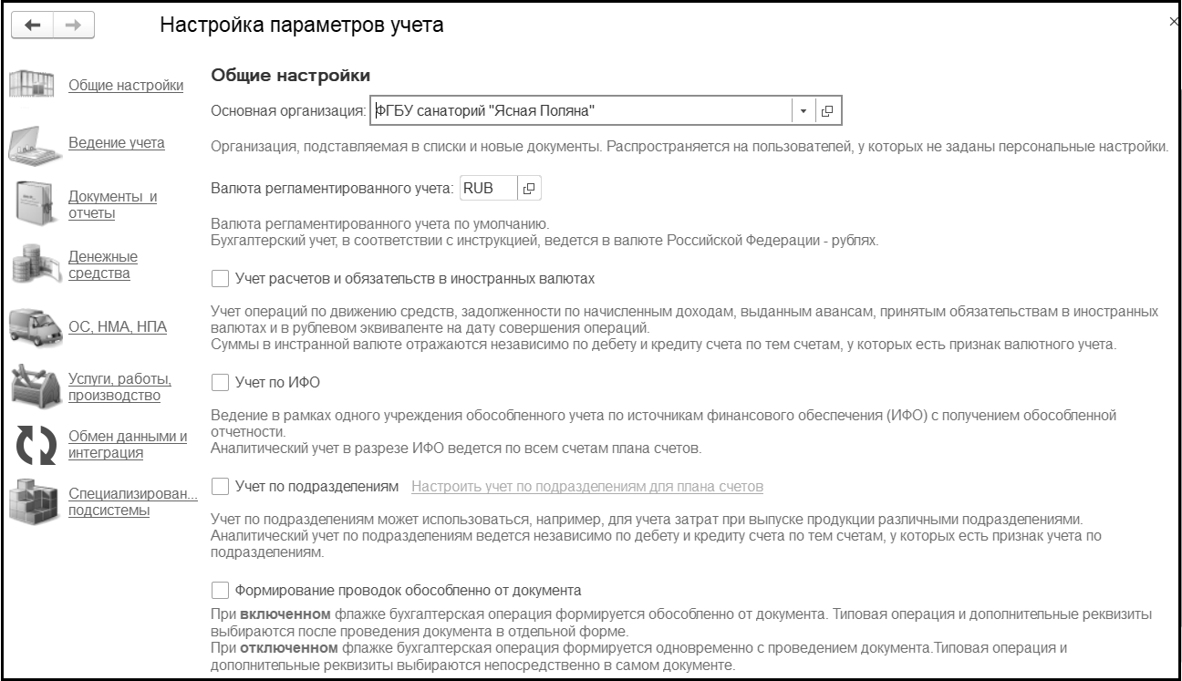 Учет по ИФО. Влияет на возможность использования источников финансового обеспечения – дополнительной аналитики в документах и бухгалтерских проводках. Источник финансового обеспечения – это обязательный реквизит бухгалтерской проводки, поэтому, если опция включена, то его заполнение обязательно.