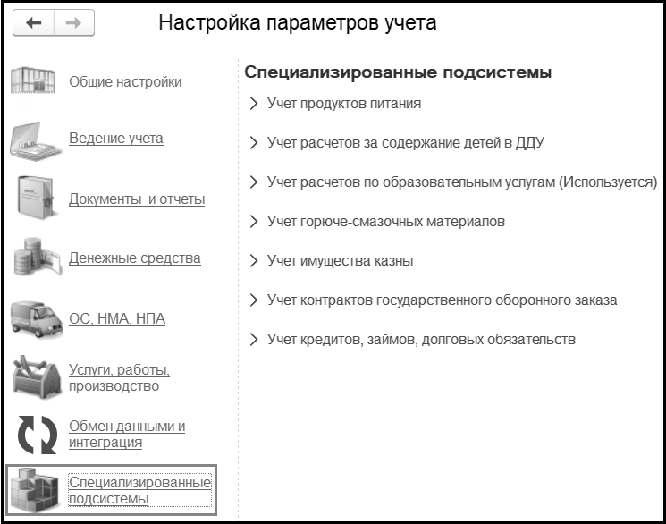 При отключении ведения учета образовательных услуг подсистема "Образовательные услуги" становится недоступна. При этом ранее введенные документы данной подсистемы можно будет просмотреть только в журнале операций.