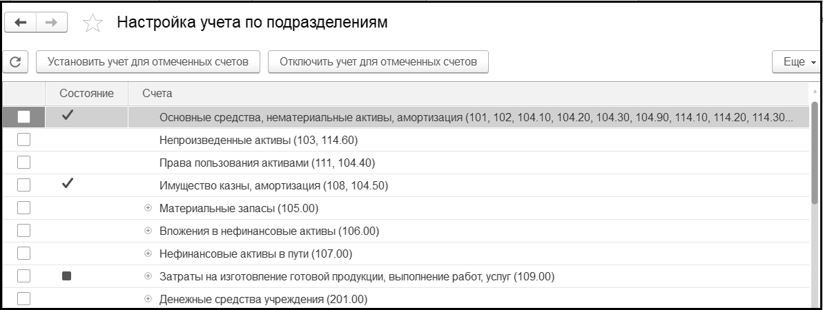 В графе Состояние указано текущее значение признака учета по счетам. Для изменения признака учета необходимо отметить требуемые счета и нажать Установить учет для отмеченных счетов или Отключить учет для отмеченных счетов. По выбранным счетам признак учета по подразделениям будет установлен или снят (в зависимости от выбранной команды).