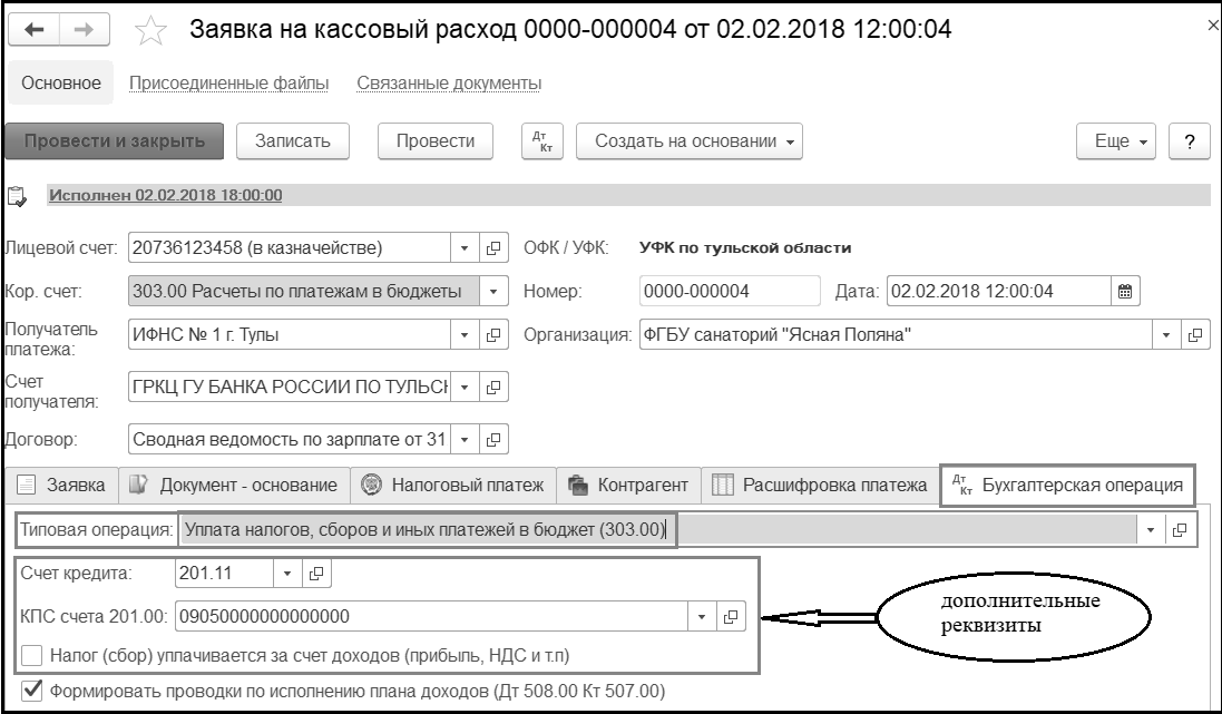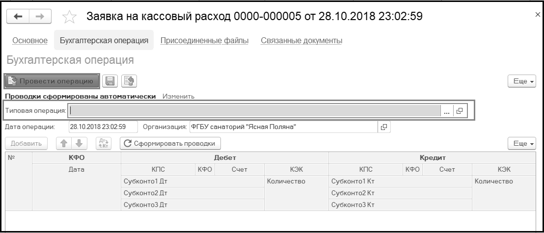 Типовая операция и дополнительные реквизиты, необходимые для формирования и проведения бухгалтерской операции, заполняются в открывшемся окне.
