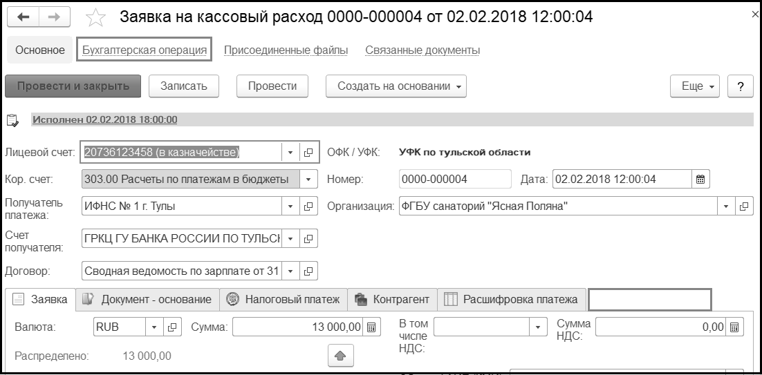 Сформированную бухгалтерскую операцию необходимо провести (кнопка Провести операцию).