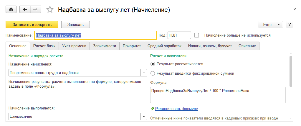 В организации используется надбавка за выслугу лет. Надбавка была добавлена в список начислений при выполнении первоначальной настройки программы.