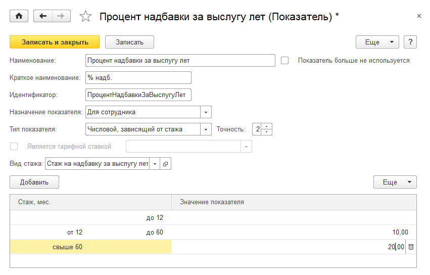 Необходимо настроить шкалу значений надбавки в зависимости от стажа.