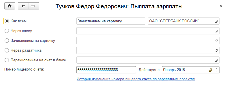 При вводе номера лицевого счета в карточке сотрудника используется ссылка "Выплаты, учет затрат" - здесь указывается порядок получения денег, номер счета и дата, с которой действует данный номер. Если получение денег по зарплатному проекту принято для организации либо подразделения, то выбирается вариант "Как всем"; если же список сотрудников для зарплатного проекта составляется без привязки к организации либо подразделению, тогда следует указать "Зачислением на карточку".