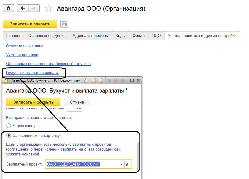 2. Настроим в карточке организации ООО "Авангард" на вкладке "Учетная политика и другие настройки" основной способ выплаты – по зарплатному проекту.