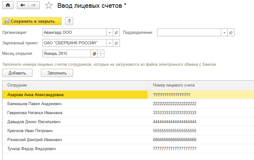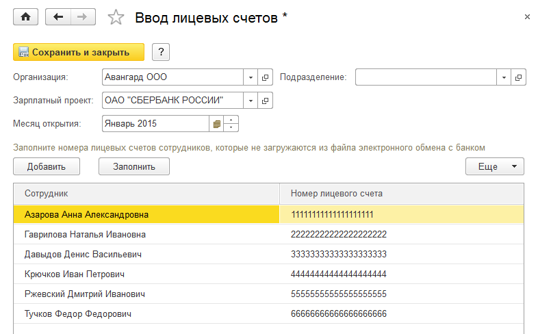 Добавим в табличную часть всех сотрудников, кроме Балмашова П.А. и введем номера лицевых счетов.