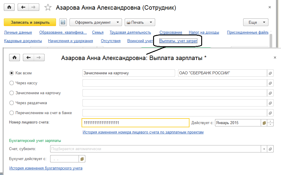 Сохраним и закроем форму ввода лицевых счетов – счета будут доступны в карточке сотрудника.