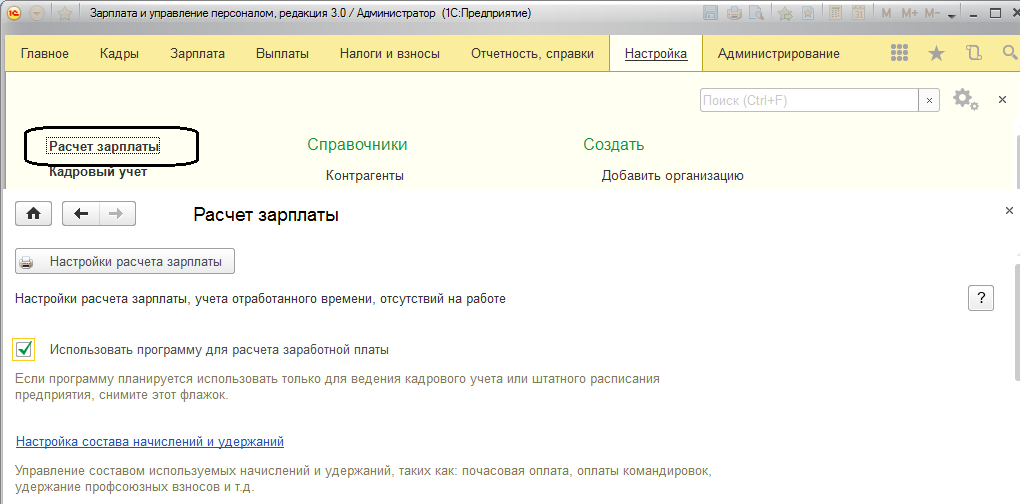 Настройка расчета зарплаты осуществляется в разделе "Настройка / Расчет зарплаты". Установка флажков осуществляется как стартовым помощником, так и вручную.