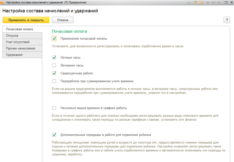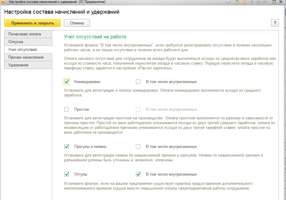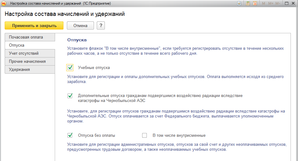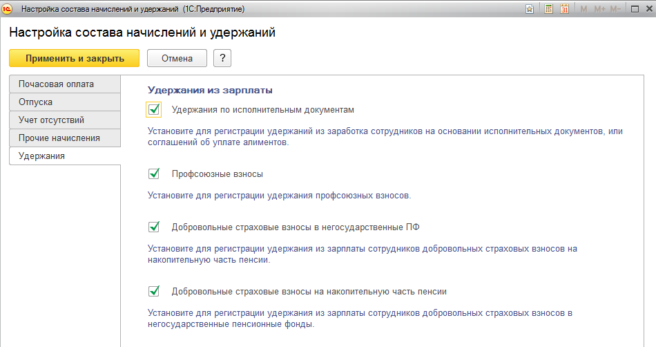 Настройки состава начислений и удержаний сохраняются по команде "Применить и закрыть".