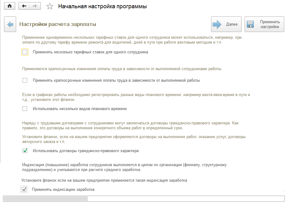 На следующем этапе продолжается выполнение настроек расчета зарплаты, при этом учитываются особенности использования тарифных ставок.