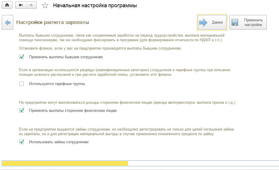 На следующем этапе продолжается выполнение настроек расчета зарплаты, что соответствует настройке из раздела "Настройка / Расчет зарплаты".