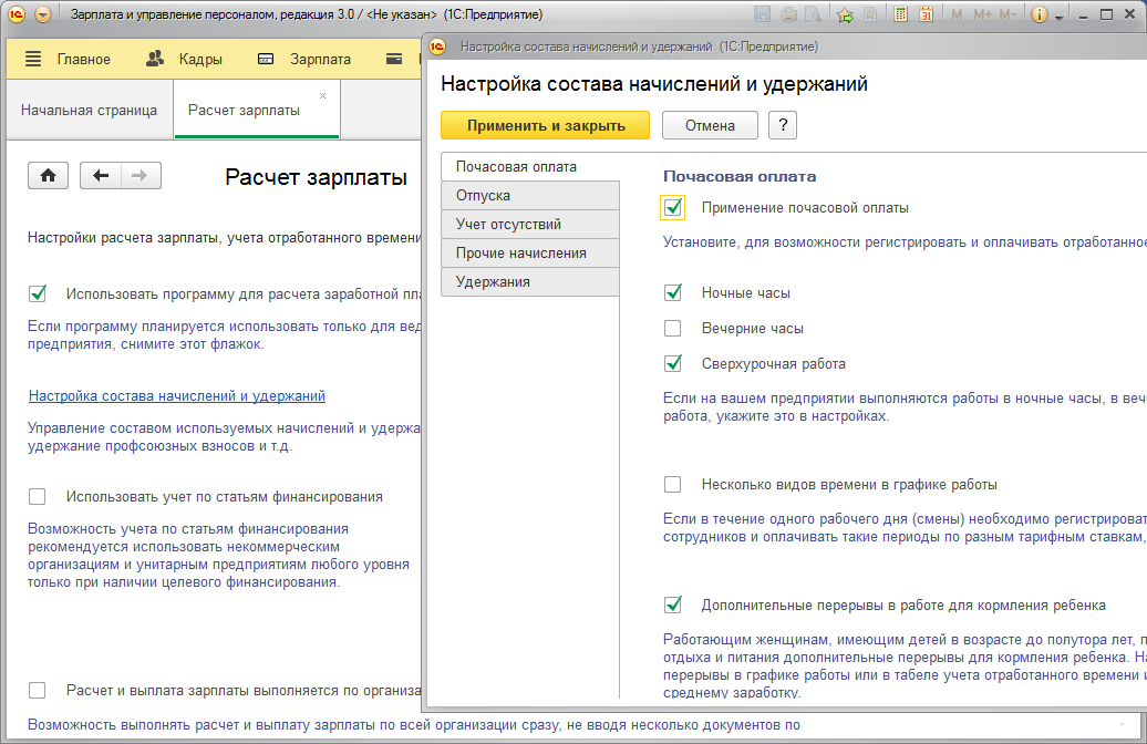 Если на предприятии учет рабочего времени ведется не только в днях, но и в часах, и некоторые начисления могут рассчитываться за определенные часы, то это следует указать. В результате станет доступна как более детальная настройка вариантов почасовой оплаты, так и появится возможность вести учет рабочего времени помимо дней еще и в часах.