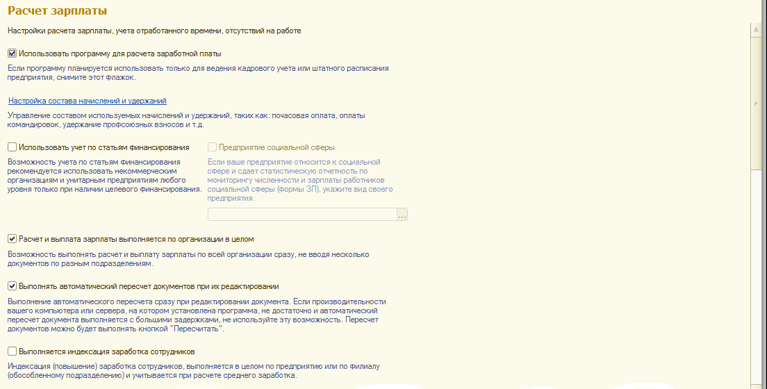 Использовать программу для расчета заработной платы" обеспечивается возможность не использовать зарплатную подсистему в данной информационной базе. По умолчанию предполагается, что программа будет использоваться для расчета заработной платы, однако в настройке расчета зарплаты можно отключить данную подсистему. В этом случае в пунктах меню будут доступны только кадровые документы.