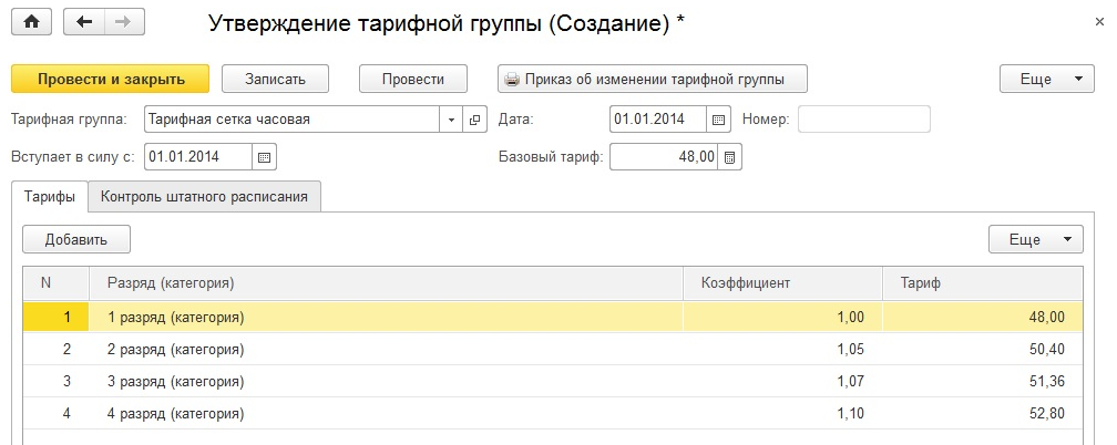 · Для штатной единицы при ведении штатного расписания доступен выбор тарифного разряда;