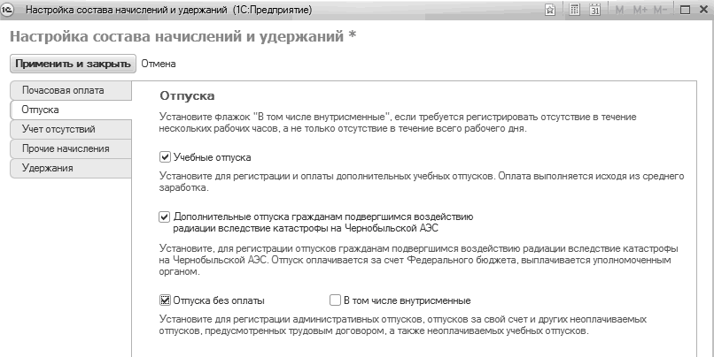 Настройка состава начислений и удержаний: отпуска