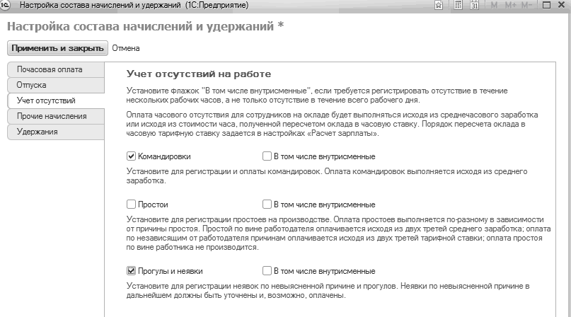 Настройка состава начислений и удержаний: учет отсутствий на работе
