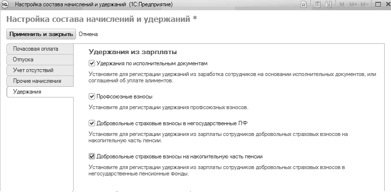Настройка состава начислений и удержаний: удержания