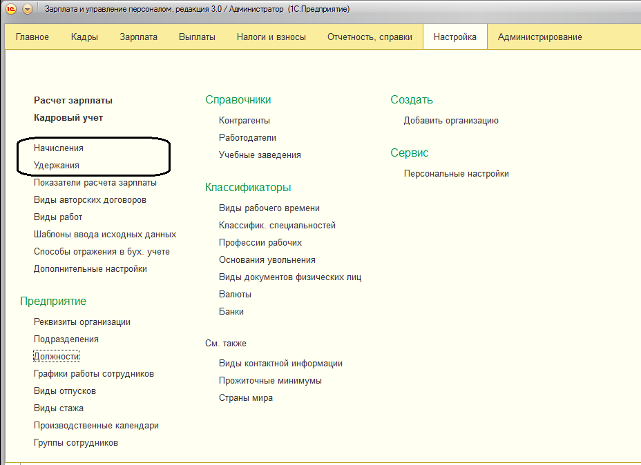Списки начислений и удержаний доступны из раздела "Настройка".
