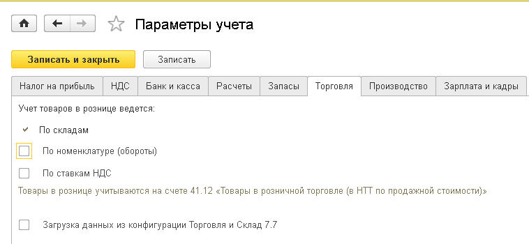 На закладке «Торговля» устанавливается возможность ведения операций по розничной торговле, а также содержит настройки аналитического учета товаров по счету 41.12 «Товары в розничной торговле (в НТТ по продажной стоимости)». Для начала определимся, что же такое НТТ? НТТ – это Неавтоматизированная Торговая Точка. То есть такая торговая точка, по которой вместе в выручкой в конце дня нельзя сказать, что же собственно было продано. Яркий пример – ларек. В конце дня никто не знает, сколько и каких шоколадных батончиков продано, есть просто сумма выручки. Что же конкретно продано определяется путем инвентаризации: знаем на какую сумму поступило товаров, по инвентаризации, знаем сколько и чего и на какую сумму осталось. Разница между этими цифрами и есть то, что продано (или украдено).