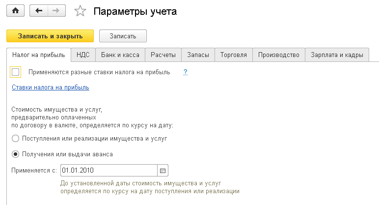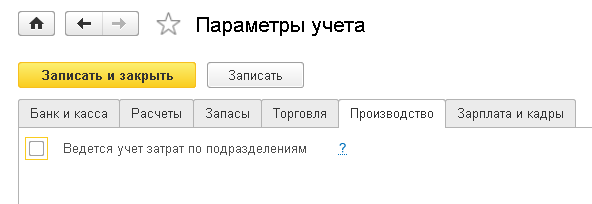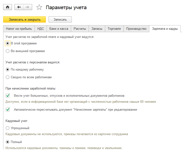 После настройки параметров учета их надо сохранить, нажав кнопку ЗАПИСАТЬ И ЗАКРЫТЬ.