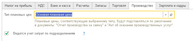 Закладка «Производство» содержит настройку нужно ли вести учет по подразделениям на счетах затрат (20,23,25,26). В дальнейшем если в справочник «Типы цен» пользователь добавит хотя-бы одну позицию, на закладке появляется еще возможность указания того типа цены, которая автоматически будет подставляться в производственные документы по выпуску продукции или оказании производственных услуг.