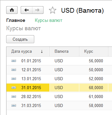 Установите курсы валюты USD. (Справочники / Валюты). При наличии доступа к интернету курсы валют будут заполняться автоматически. Для нашего примера можно установить курсы вручную согласно картинке (курсы условные):