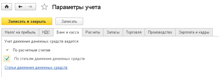 Также эта закладка содержит флаг «По статьям движения денежных средств». Включение данного флага добавляет или наоборот убирает соответствующий вид субконто по счетам учета кассы и банка.