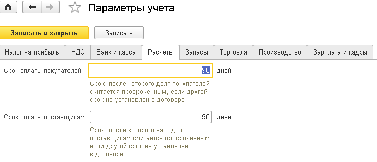 На закладке "Расчеты" можно настроить общий срок оплаты для всех контрагентов, по истечении которого долг покупателя и долг продавца будут считаться просроченными, если иное не установлено в договоре (в форме договора поле называется "Установлен срок оплаты"