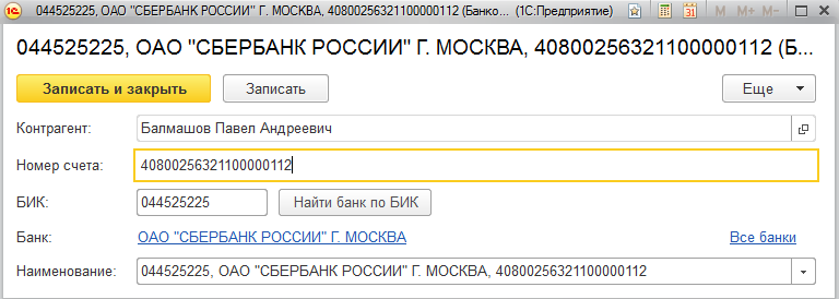 В справочнике "Банковские счета контрагентов" создадим лицевой счет данного сотрудника в Сбербанке (БИК 044525225), № счета 40800256321100000112. При вводе следует ввести БИК и нажать кнопку "Найти банк по БИК".