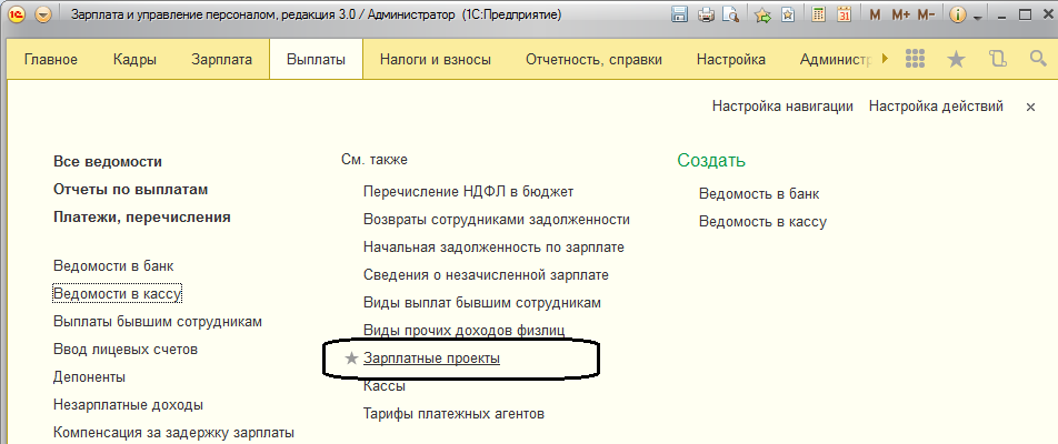 Справочник "Зарплатные проекты" доступен в разделе "Выплаты".