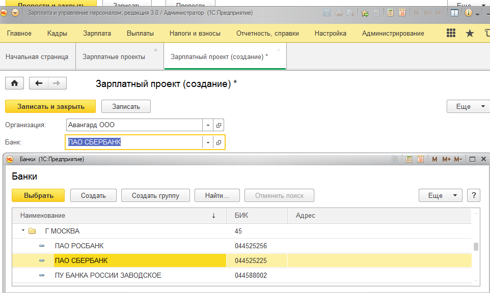 1. Добавим в справочник "Зарплатные проекты" новый зарплатный проект для Сбербанка (банк выбирается из справочника "Банки" и уже заполнен в учебной базе).