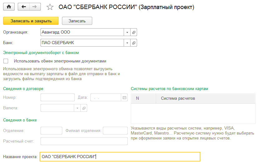 Если в организации не планируется использовать встроенный электронный обмен с банками, то при заполнении зарплатного проекта достаточно указать его наименование.