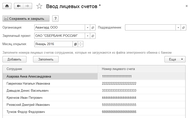 Добавим в табличную часть всех сотрудников, кроме Балмашова П.А. и введем номера лицевых счетов.