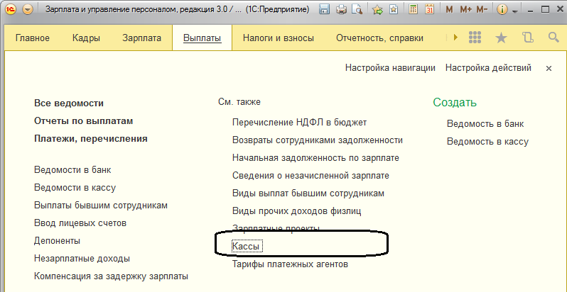 По умолчанию, если не выполнены никакие настройки мест выдачи зарплаты, выплата производится в кассу. Если в организации одна касса, то сведения о кассах можно не заполнять.