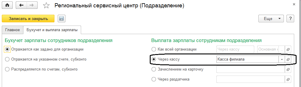 В карточке подразделения установим переключатель на позицию через кассу и укажем кассу филиала.