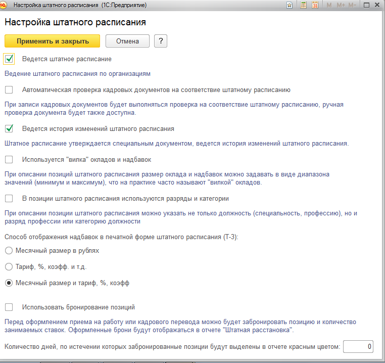 Использовать бронирование позиций – возможность до приема либо перевода сотрудника "занять" для него позицию в штатном расписании. Также См. также раздел "Особенности документов по приемам на работу".