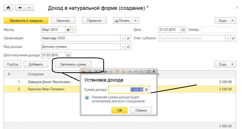 Сотрудники ООО «Авангард» Давыдов Д.В. и Крючков И.П. получили в марте детские путевки стоимостью на каждого сотрудника 2 540 руб. Зарегистрируем такие доходы с помощью документа "Доход в натуральной форме", создав его из раздела «Зарплата /Все начисления».